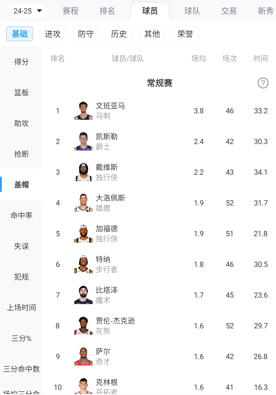 本赛季,文班亚马代表马刺出战46场常规赛,场均贡献24.3分11篮板3.7助攻1.1抢断3.8盖帽。在盖帽一项数据当中,文班断档领先第二名的爵士球员凯斯勒。