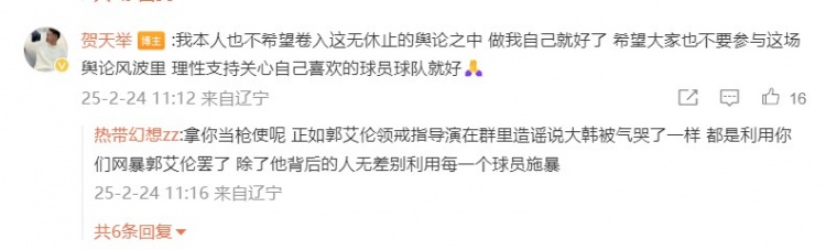 之后,贺天举还在这条动态的评论区写道:“我本人也不希望卷入这无休止的舆论之中 做我自己就好了 希望大家也不要参与这场舆论风波里 理性支持关心自己喜欢的球员球队就好????”