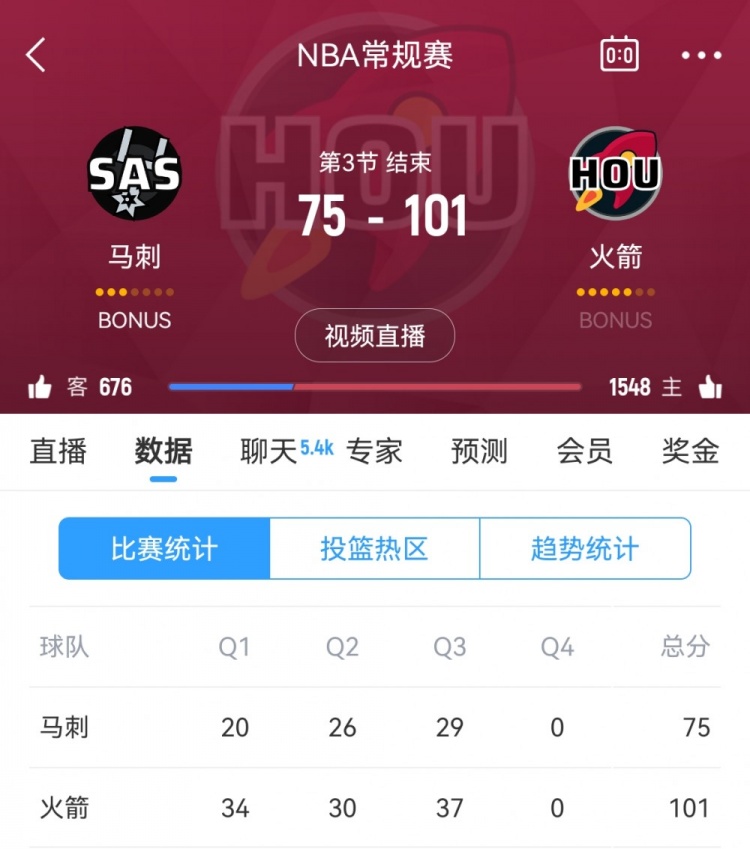 2月27日讯 NBA常规赛,火箭三节结束101-75领先马刺。