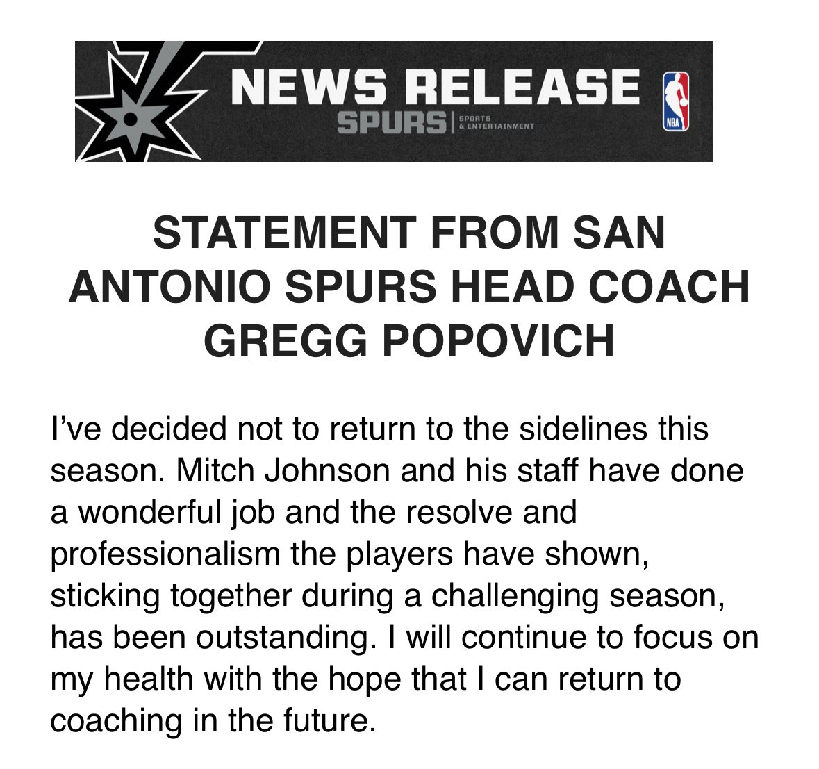 波波维奇在声明中表示:“我决定本赛季不会再回到场边,米奇-约翰逊和其团队的工作做得非常不错,球员们也表现出了决心和职业精神,他们在充满挑战的赛季中团结一致,非常出色。我会继续关注我的健康状况,希望未来能重返教练岗位。”