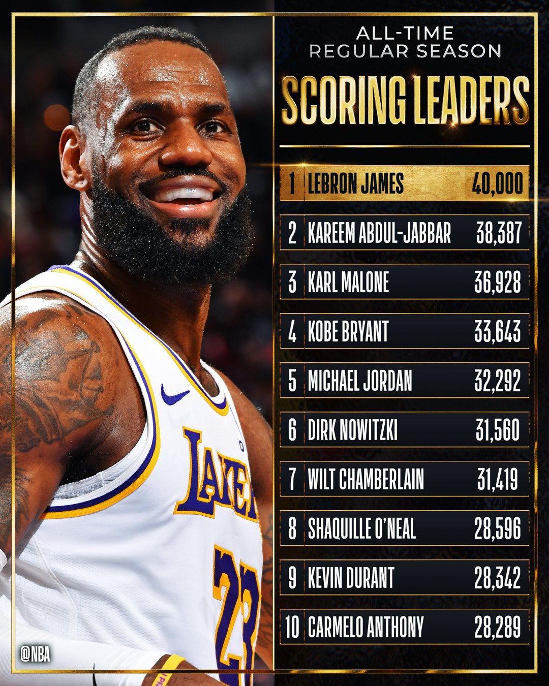 3月3日讯 去年今日,湖人球星勒布朗-詹姆斯生涯总得分突破40000,NBA历史首人。