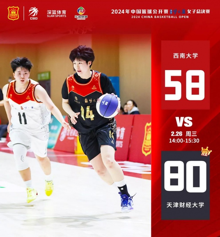 上半场首节,两队打得相对胶着,比分紧咬。第二节,西南大学手感欠佳,单节只得到9分。天津财经大学则保持着不错的进攻势头,单节拿到25分。半场结束,天津财经大学37-24领先西南大学。下半场,西南大学7号应茵、12号莫琇雅前后场篮板拼抢积极,但无奈前期存在一定差距,最终西南大学58-80不敌天津财经大学。