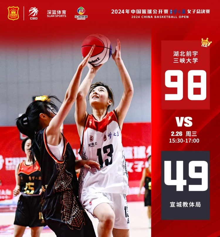 上半场,湖北前宇三峡大学11号刘欣怡、2号张欢分别命中两分,帮助球队取得领先。宣城教体局6号张紫涵扳回两分后,湖北前宇三峡大学在技术和经验上的优势逐渐显露,打出一波8-0的得分潮。半场结束,湖北前宇三峡大学53-21领先宣城教体局。易边再战,宣城教体局虽然顽强拼搏,但年轻小将在实力上和对手还是存在着差距,将分差越拉越大。最终,湖北前宇三峡大学98-49战胜宣城教体局。