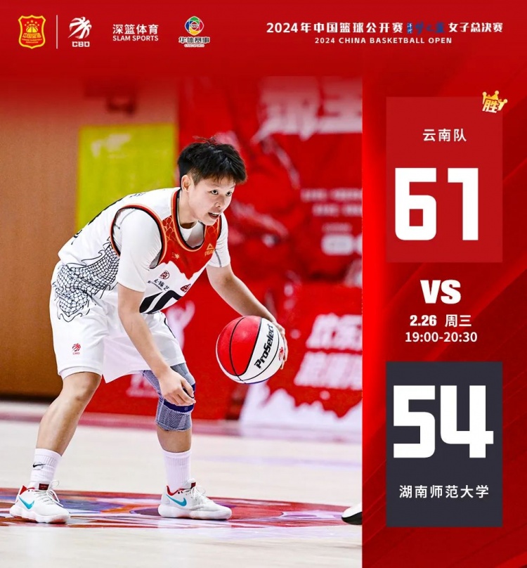 云南队和湖南师范大学在本轮相遇,实力相当的两支球队打得相对胶着。上半场,10平后,湖南师范大学30号赵诗雨两分命中,随后6号沈思榆外线再贡献一个三分球,15-10湖南师范大学超出。云南队依靠6号罗菲和14号娜汉的进攻紧咬比分。半场结束云南队落后湖南师范大学1分。下半场,两队依旧难解难分。在云南队几次外线得分实现反超,14号娜汉外投内突,连续得分,云南队士气大涨,最终云南队61-54战胜湖南师范大学。