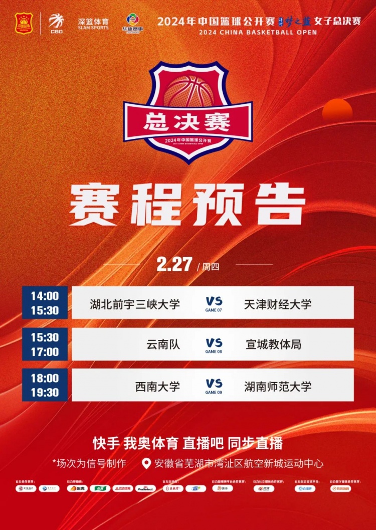 2月26日,2024年中国篮球公开赛洋河梦之蓝女子总决赛继续在安徽省芜湖市湾沚区航空新城运动中心进行。在第二轮结束的三场比赛中,天津财经大学、湖北前宇三峡大学收获首场胜利,云南队力克湖南师范大学取得两连胜。
