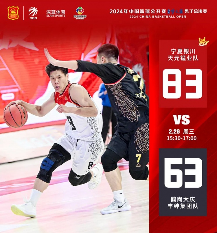 上半场,宁夏天元锰业一波7-0开局,打停大庆丰绅集团。暂停回来,宁夏天元锰业在抢到后场篮板后,积极组织快攻,11-1宁夏天元锰业领先。随后大庆丰绅集团增强防守,同时手感开始回暖,但宁夏天元锰业在前后场篮板和进攻上发挥的更加出色。半场结束,宁夏天元锰业44-24大庆丰绅集团。下半场,宁夏天元锰业继续保持进攻势头,最终天元锰业83-63大庆丰绅集团。