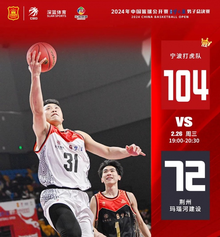上半场,宁波打虎一上来就展现出了强大的进攻实力,以6-0开局。荆州玛瑙河建设通过外线打开局势,紧咬比分。半场结束,宁波打虎43-41荆州玛瑙河建设。下半场,随着体力的下降,荆州玛瑙河建设手感欠佳,反观宁波打虎体能依旧充沛,98号王宇牢牢掌控篮下,13号李琳、4号江楠越打越顺,最终宁波打虎104-72战胜荆州玛瑙河建设。