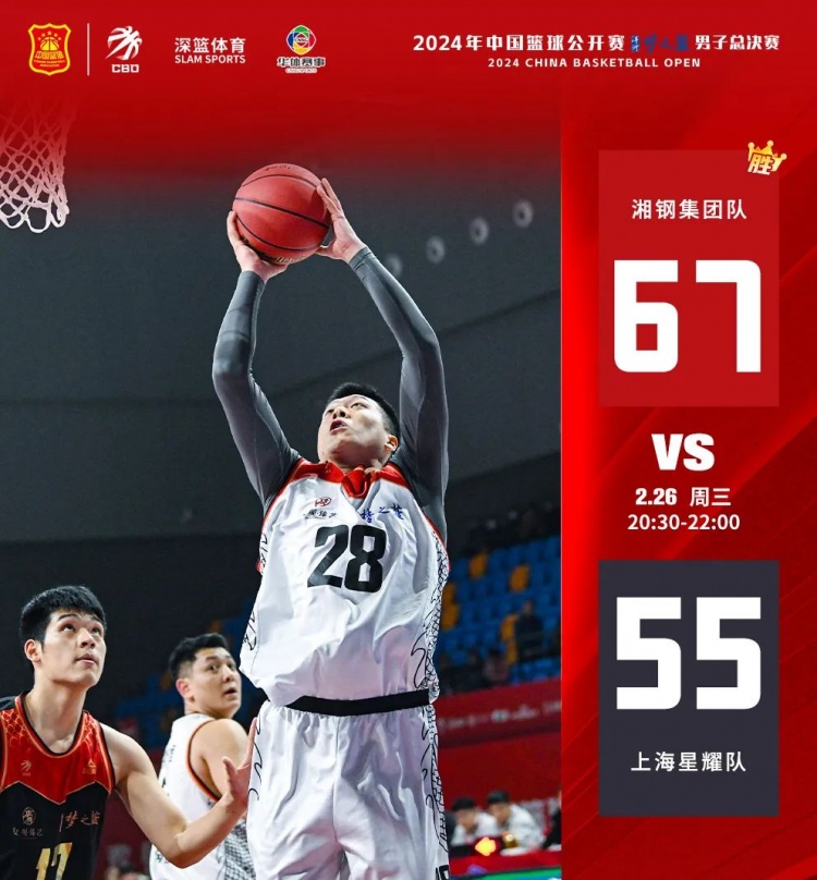 上半场开始,湘钢集团进攻十分强势,取得9-4领先。26号陈双、28号蔡士港相继投篮命中,上海星耀出现失误,首节湘钢集团24-11领先上海星耀。次节,上海星耀加强防守并在篮板的拼抢中更积极主动。但湘钢集团没有给其太多机会,半场结束,湘钢集团领先上海星耀16分。下半场,两队没有拉开太大分差,依靠上半场的领先优势,湘钢集团以67-55战胜上海星耀。