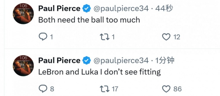 名宿皮尔斯发推写道:“我认为詹姆斯和东契奇不合适,他俩都需要大量持球。”