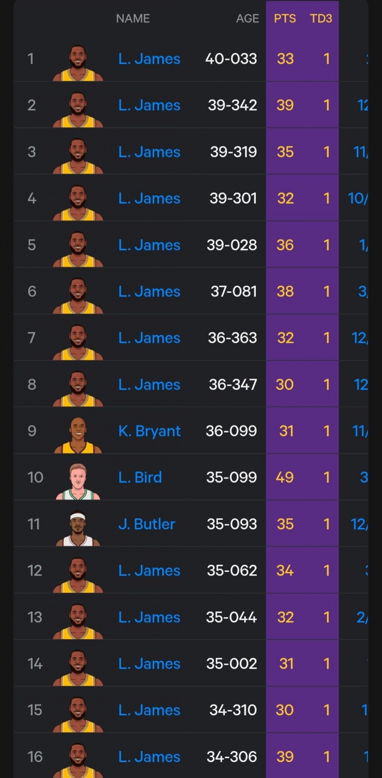 至此,40岁33天的詹姆斯再次刷新了自己保持的“联盟砍三双最老的球员”纪录,原先纪录是在詹姆斯39岁342天的时候创下。