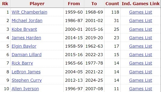 据统计,这是哈登生涯第24场常规赛50+,历史第4多,仅次于张伯伦(118)、乔丹(31)、科比(25)。