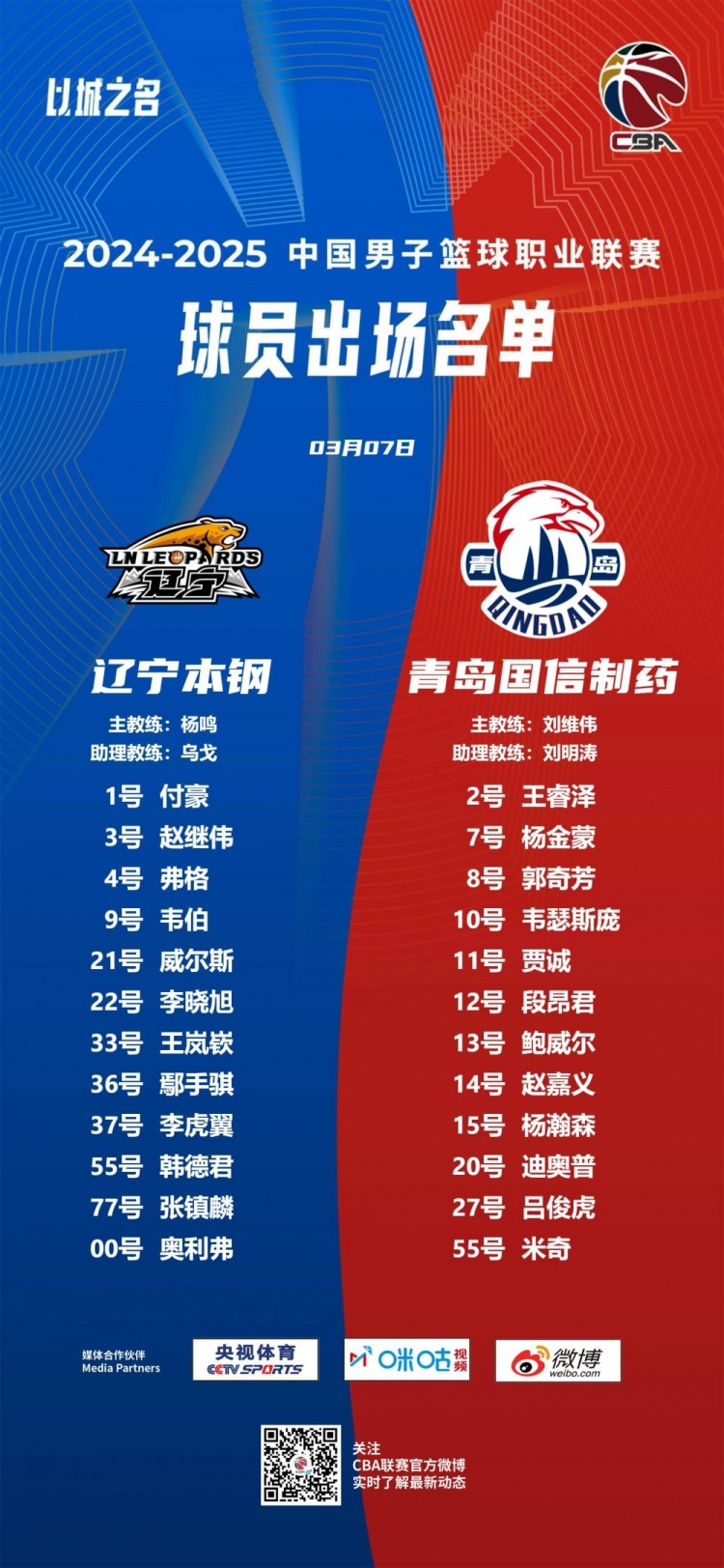 辽宁VS青岛大名单:赵继伟张镇麟弗格领衔对阵杨瀚森王睿泽