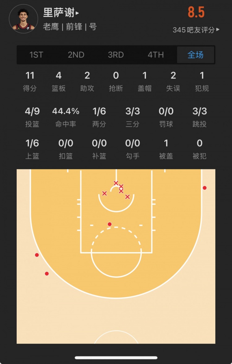 老鹰状元秀 扎卡里-里萨谢 登场24.9分钟