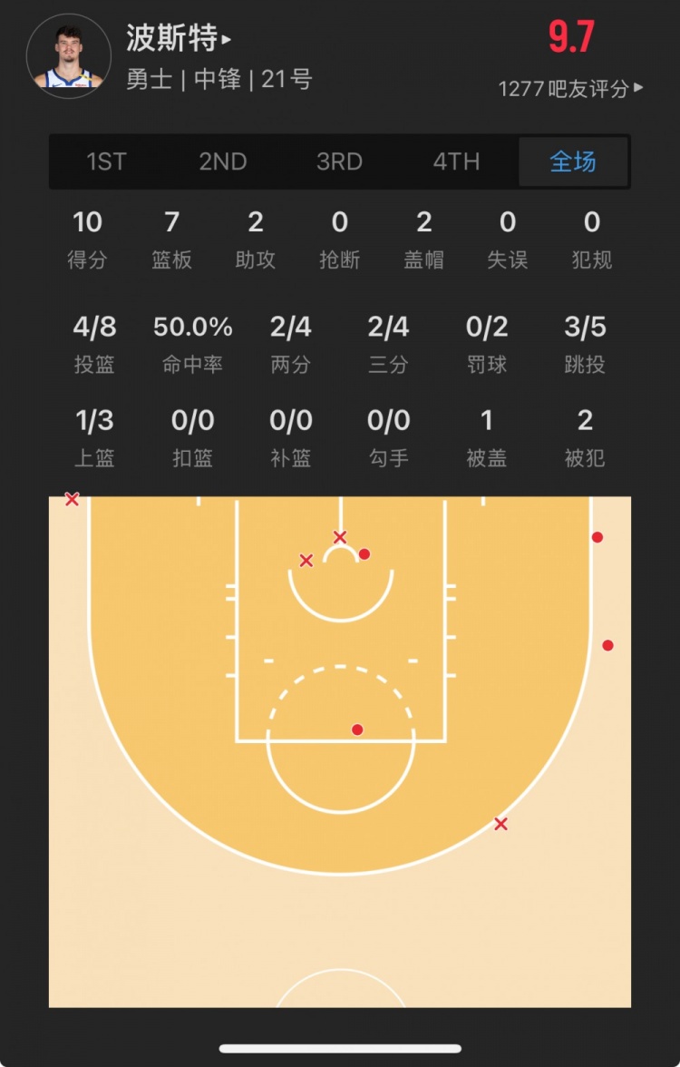 勇士52号秀 昆滕-波斯特 登场21.1分钟