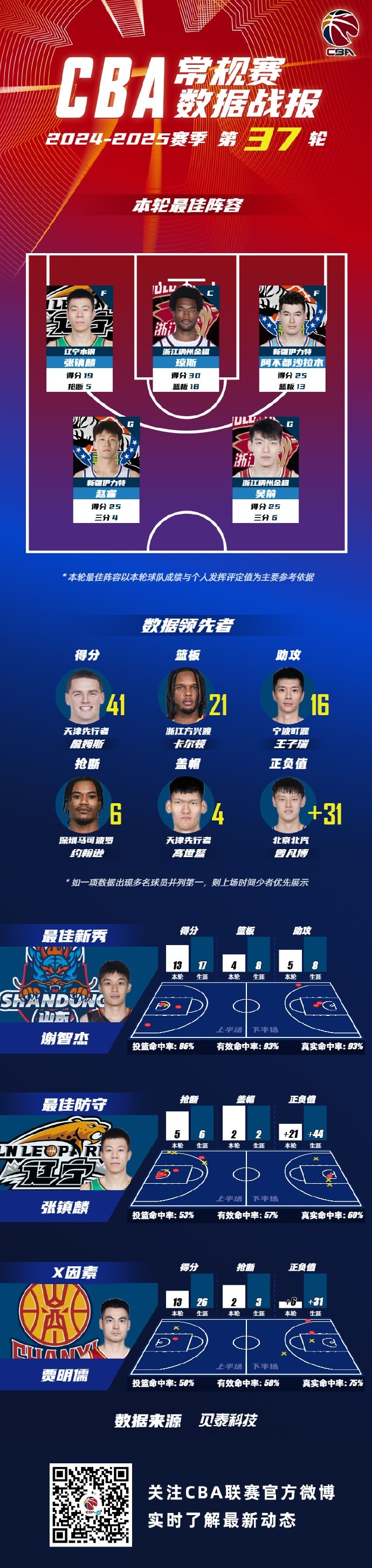 2024-2025赛季CBA联赛常规赛第37轮结束较量,来自辽宁沈阳三生飞豹篮球俱乐部的张镇麟 ,浙江稠州篮球俱乐的琼斯和吴前 ,新疆广汇篮球俱乐部的阿不都沙拉木和赵睿入选CBA联赛常规赛第37轮最佳阵容!