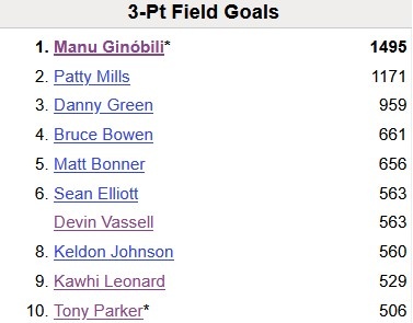 至此,瓦塞尔生涯三分命中数来到564个,超越埃利奥特,独占马刺队史第6位!