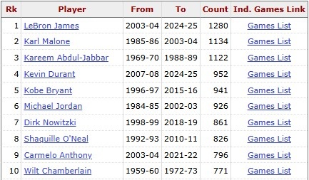 这是杜兰特常规赛生涯第953场单场20+,同样排在历史第四,仅次于詹姆斯(1280)、卡尔-马龙(1134)和贾巴尔(1122)。