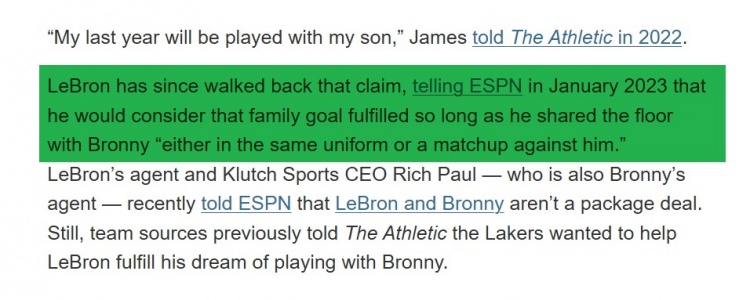 2022年2月,詹姆斯在接受The Athletic采访时第一次谈到父子同台的愿望:“我在生涯最后一年会和我儿子一起打球,无论布朗尼在哪里,我都会去那个地方。我愿意做任何事情来实现与我的儿子一起打球一年。届时钱也就不重要了。”
