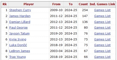 吹杨生涯67次至少30分+5三分 与詹姆斯并列历史第8&库里断档第一