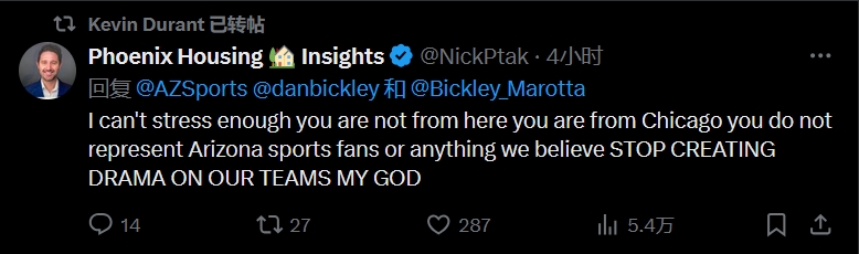 球迷一:我简直不能更强调这一点,你不是本地人,你是芝加哥人,不能代表亚利桑那州的体育迷,也不能代表我们的任何想法。停止在我们的球队制造闹剧吧,老天啊!
