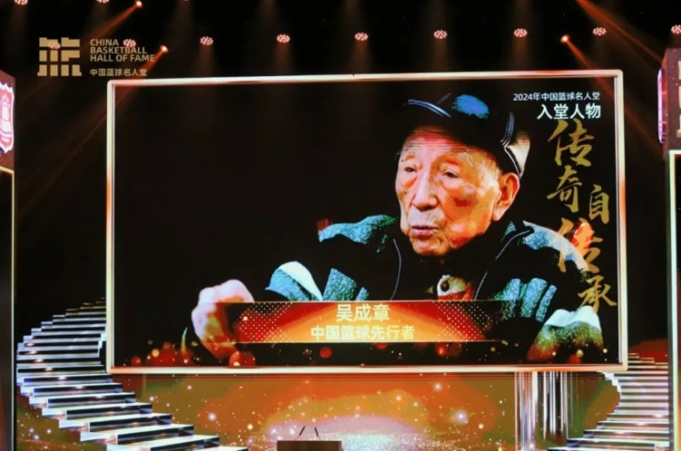 现年101岁的吴成章老人是李震中先生1948年奥运会的队友,虽然无法亲临现场,他仍通过视频表达了自己进入名人堂的喜悦。吴老之子吴忻水代父亲领取名人堂徽章,并分享了他们之间的“父子篮球”轶事。