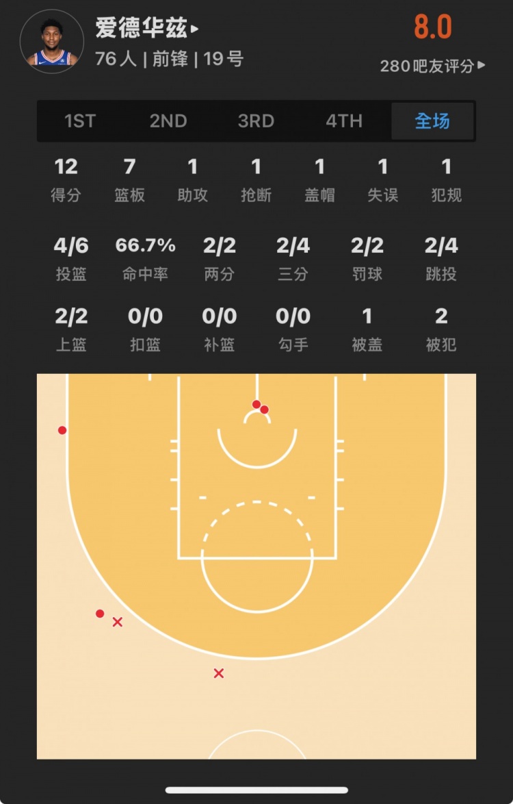 76人41号秀 阿德姆-博纳 登场12.5分钟