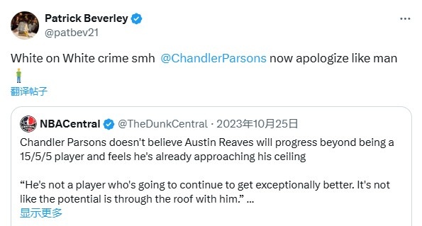 今天,贝弗利则打脸帕森斯,转发了后者曾说“里夫斯15+5+5就已经到极限了”的言论,并写道:“白人看不起白人,无语了,像个男人一样出来道歉!”