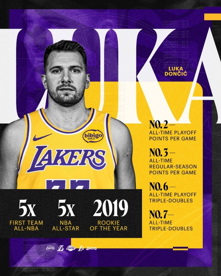 25岁!湖人晒东契奇履历:5次一阵&5次全明星 季后赛场均30.9分