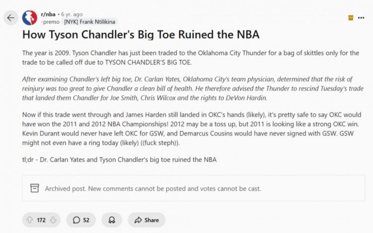 6年前reddit网友发帖:钱德勒的大脚趾毁了NBA