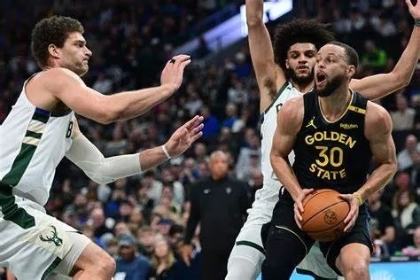 吉米自己背身拿球,让雄鹿高塔洛佩斯得在意这一侧;追梦内切,库里突破直取洛佩斯。