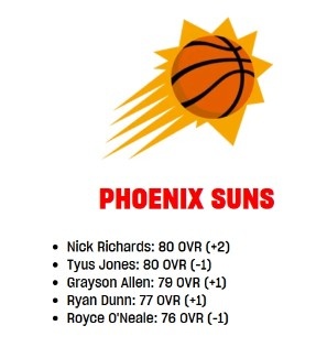 1月31日讯 NBA2K本周更新,太阳队内球员的能力值有所变化,新援理查兹由78上涨至80。