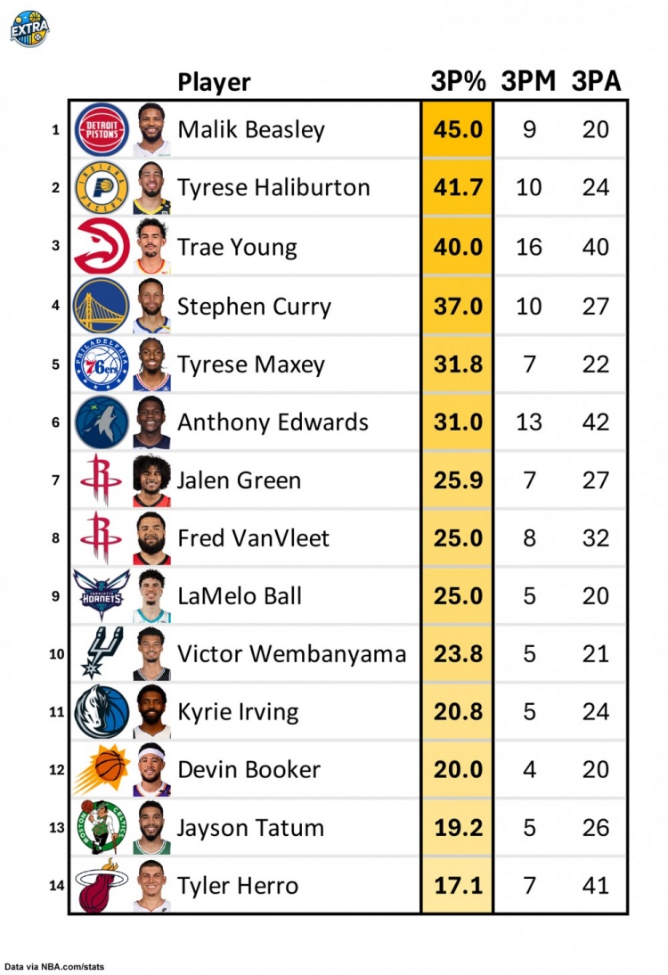 本季共14人在关键时刻出手20+记三分 比斯利45%最准 库里37%第四
