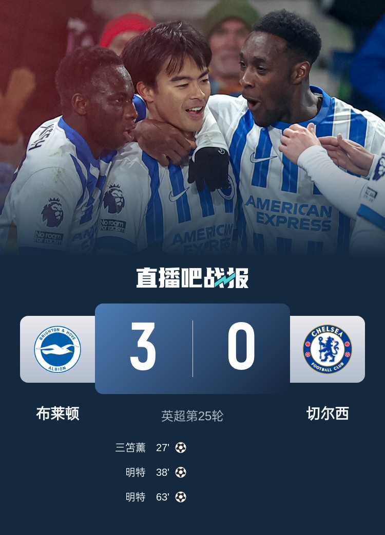 英超第25轮,切尔西客场0-3布莱顿。上半场,三笘薰完美停球兜射破门,明特再下一城;下半场,明特再入一球完成双响。