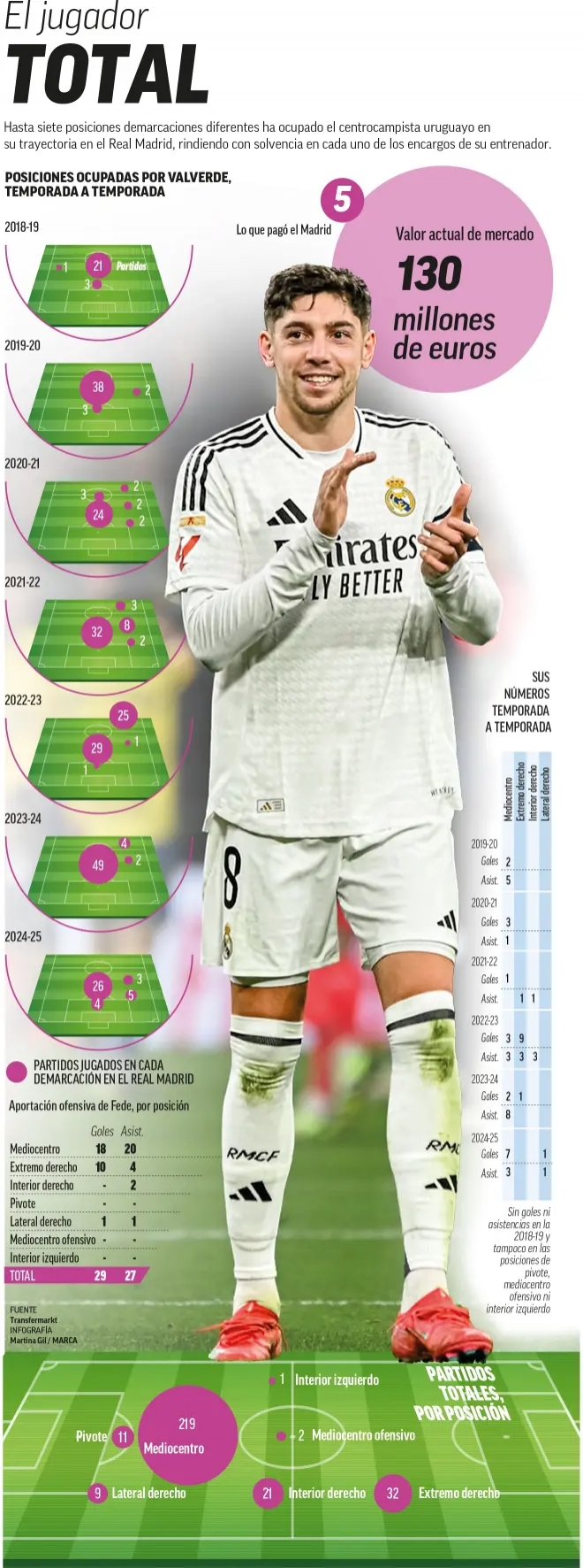 巴尔韦德的主业则是中场,500万欧转会费买下的他,如今身价1.3亿欧。而实际上,身兼多职的他毫无疑问是无价的:边中场,居中,前腰,后腰……师从克罗斯的巴尔韦德,总共担任过7个不同的位置。