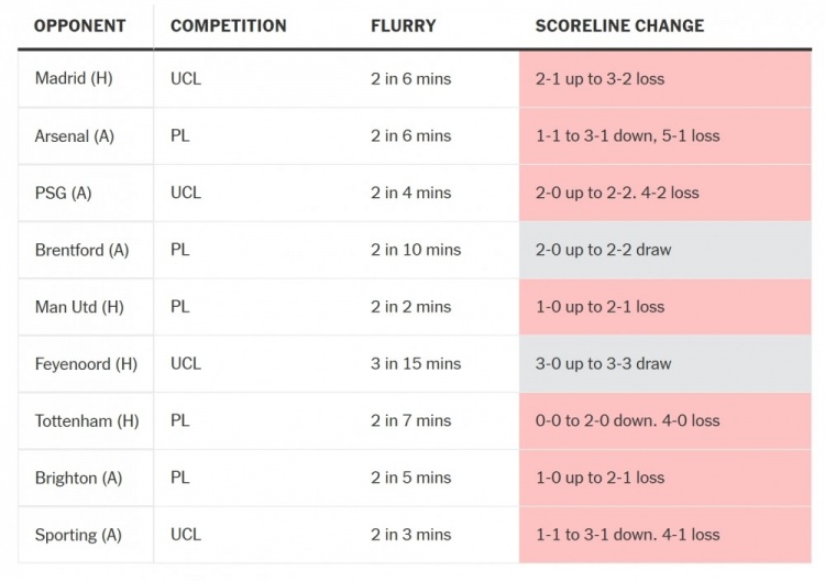 曼城最近9场在10分钟内连丢两球的比赛统计