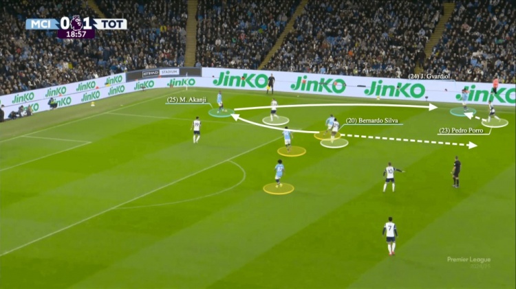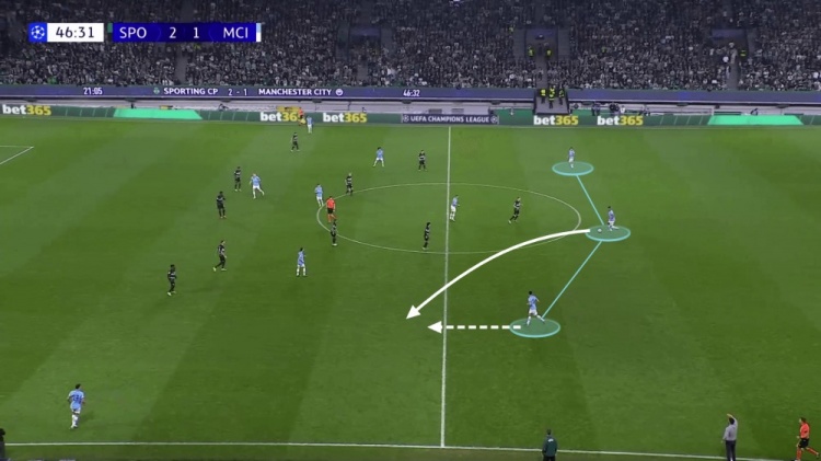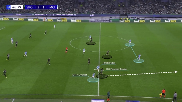 最明显的例子是对阵葡萄牙体育的比赛。曼城在下半场一开始就失误了,一个简单的二过一足以让贡萨尔维斯从他们的中场身后进入。他传球给边后卫马克西米利亚诺-阿劳霍,然后皮球越过了埃德森把守的大门。阿劳霍破门后仅86秒,葡萄牙体育就获得了一个点球。从开球开始,曼城就立即转变为3-1-3-3阵型来对阵葡萄牙体育的五后卫。阿坎吉将球传给了格瓦迪奥尔,后者在理论上来说是有足够向前推进的空间。