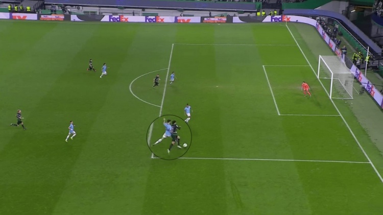他有三个合理的选择:传给马修斯-努内斯,或者将球转移到右路的萨维尼奥,亦或者向后传递。但格瓦迪奥尔都没有选,而是选择了最困难的路线,传球给身处重兵集结区域的福登,而且他还没有足够的传球精度。葡萄牙体育获得了球权,立即进入了格瓦迪奥尔推进留下的空间。