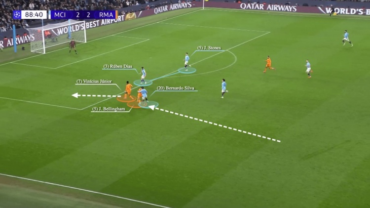 甚至在对阵皇马的比赛中,此前一直很可靠的斯通斯,也出现了失误。他在比赛中扮演6号角色,在开局后移动到了左中后卫的位置上。他传球给贝尔纳多-席尔瓦,就不是一个合适的选择。贝林厄姆拦截了这次传球,并带球向前推进,贝尔纳多-席尔瓦在禁区外将其包夹,但这一次并没有判罚。