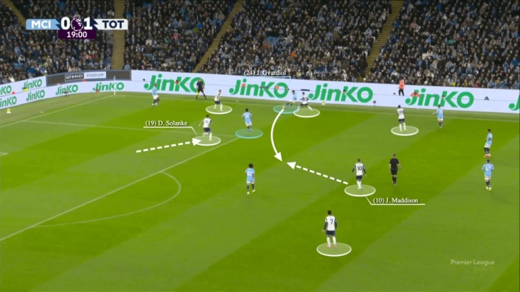 热刺右后卫波罗逼近,格瓦迪奥尔无法传球给阿坎吉或者埃德森。因此他试图小角度传球给京多安。热刺前锋索兰克预判了格瓦迪奥尔的动作,而格瓦迪奥尔的传球也出现了失误——球直接传给了麦迪逊。