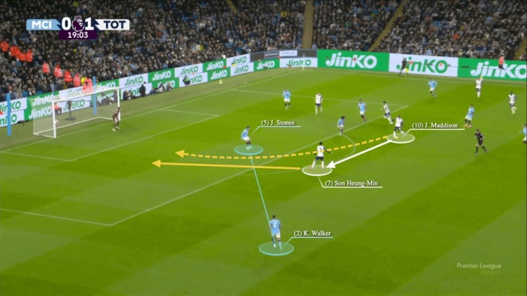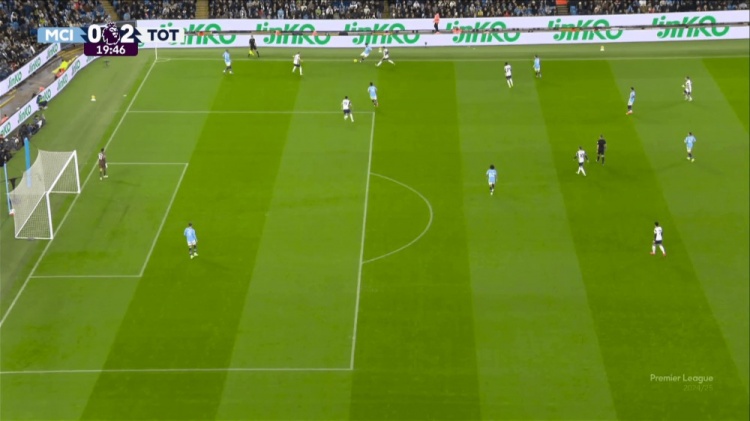 这其中一个复杂的问题在于右后卫凯尔-沃克的位置。他在边线附近,也没有出现在上图之中。这样的宽度对于曼城这样的球队确实是非常重要的,但一旦出现失误,就会给对手留下很大的进攻空间。也正是因为如此,热刺仅用两次传球就制造了一对一的机会。