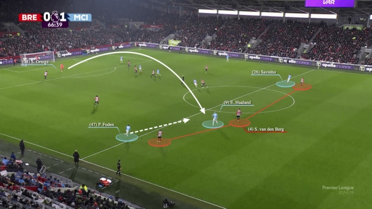 那场比赛的早些时候,面对布伦特福德的人盯人逼抢,哈兰德扛住了对方防守球员,给了福登和萨维尼奥跑动的空间。