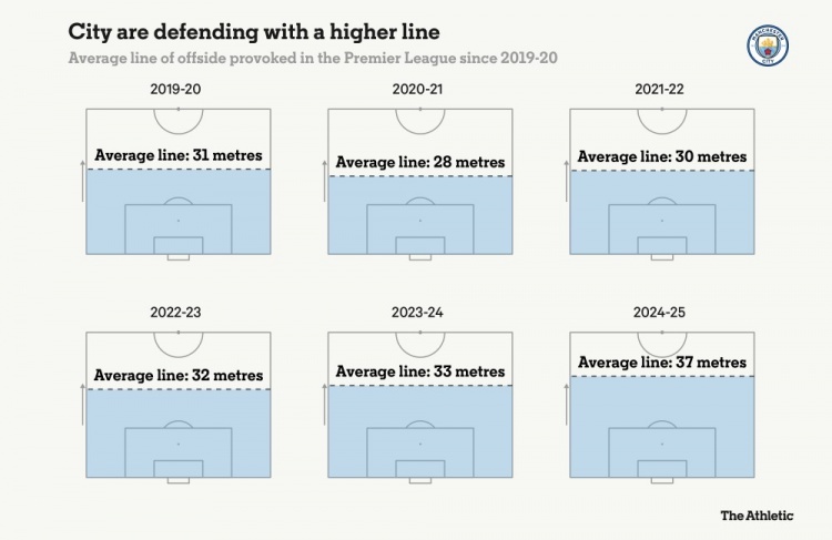 自2019/2020赛季以来,曼城防线高度的变化统计