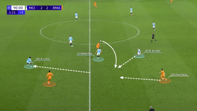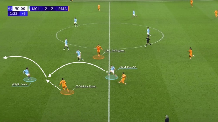 尽管科瓦西奇回过神来,完成了一次抢断,但获得球权之后的他,应该将这个球直接送到前场,或者回传给埃德森。相反,他将球传给了刘易斯,且传球并没有成功。维尼修斯率先得到了球,并突破刘易斯,快速向前推进。