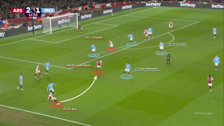 即便客场对阵阿森纳的比赛中有10名外场球员参与防守,但他们的站位真的太松散了。马尔穆什和斯凯利的距离不够紧,以至于后者能轻松接到德克兰-赖斯的传球。科瓦西奇出现在后防线身前,但其实也没有做到什么保护。