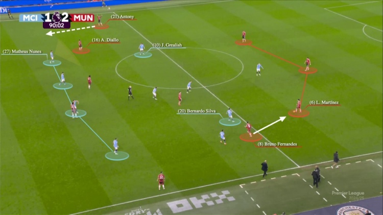 他们在中路的防守很紧凑,但曼联并没有施加什么压力。替补出场的贝尔纳多-席尔瓦不确定是否是向利桑德罗-马丁内斯施压,还是等待布鲁诺-费尔南德斯的跑动——后者在边路游弋。下面这个瞬间,我们能明显看到哈兰德希望贝尔纳多-席尔瓦能够施压。