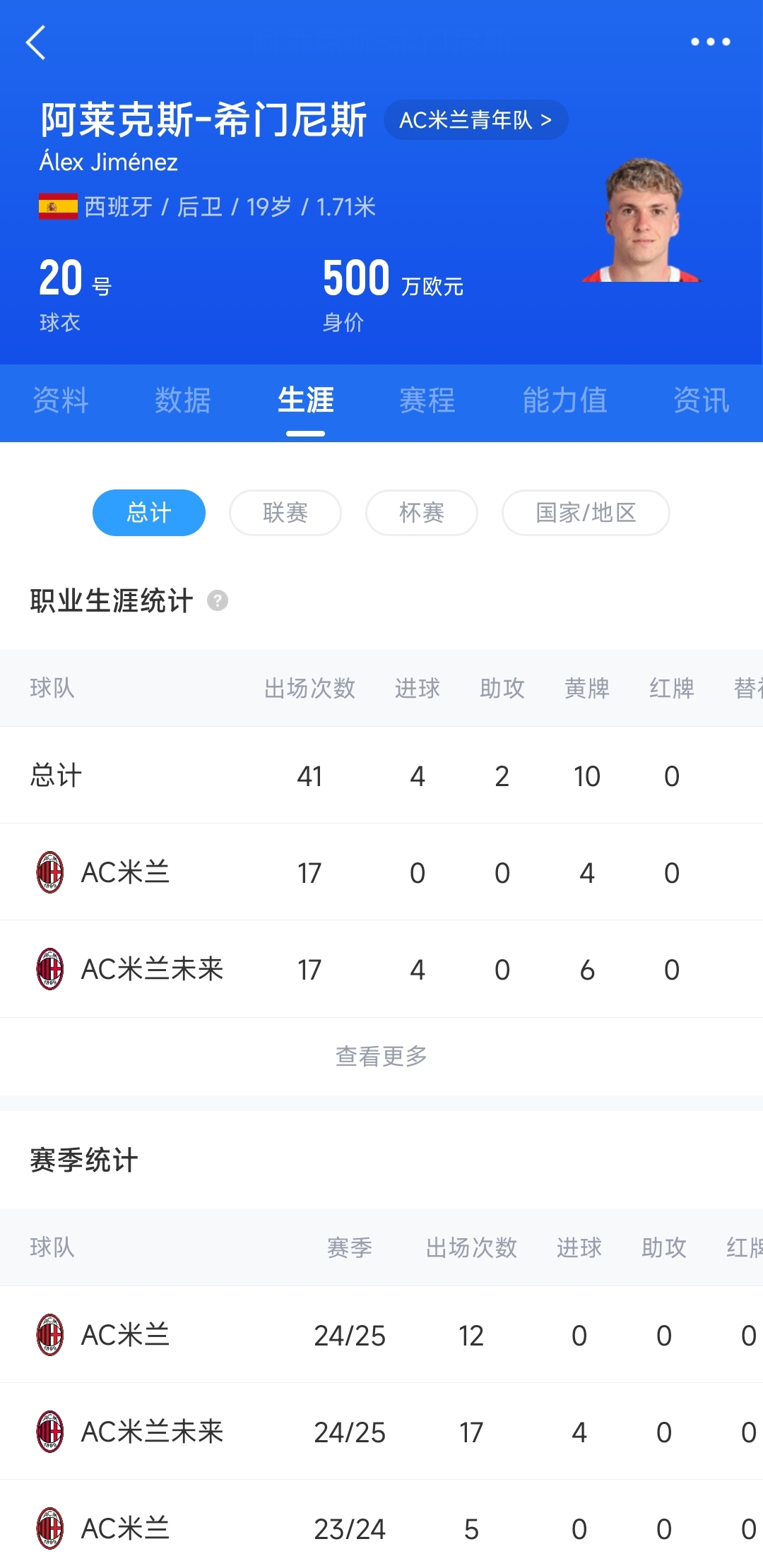 2024年夏窗,希门尼斯以500万欧元的买断费正式从皇马加盟米兰,签约至2028年。本赛季希门尼斯已经代表AC米兰出战12场比赛,出场时间685分钟。