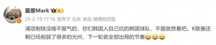 媒体人苗原发文表示:浦项铁人没啥不服气的,你们韩国人自己坑的韩国球队,不服就憋着吧。K联赛还剩已经削弱了很多的光州,下一轮就全部出局的节奏。