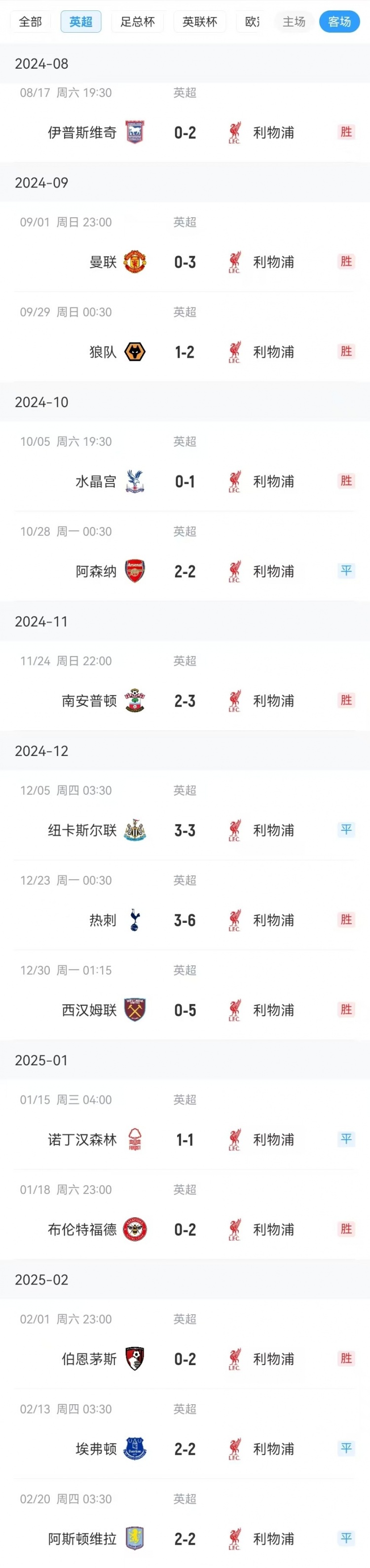 数据统计显示,利物浦在本赛季共计14个英超客场比赛取得9胜,仅被5次逼平,至今保持不败。
