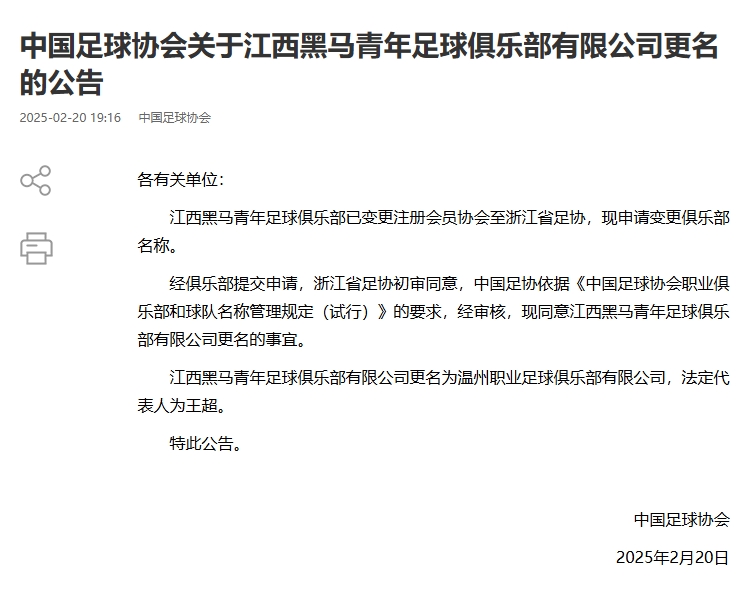 02月20日讯 中国足协官宣5家职业足球俱乐部的更名事宜,此前这5家俱乐部已经变更注册会员协会,也就是俗称的“异地搬迁”。