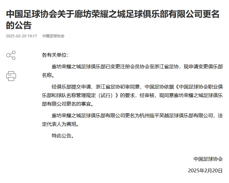 异地搬迁!足协官宣5家俱乐部更名:定南赣联 杭州临平吴越......